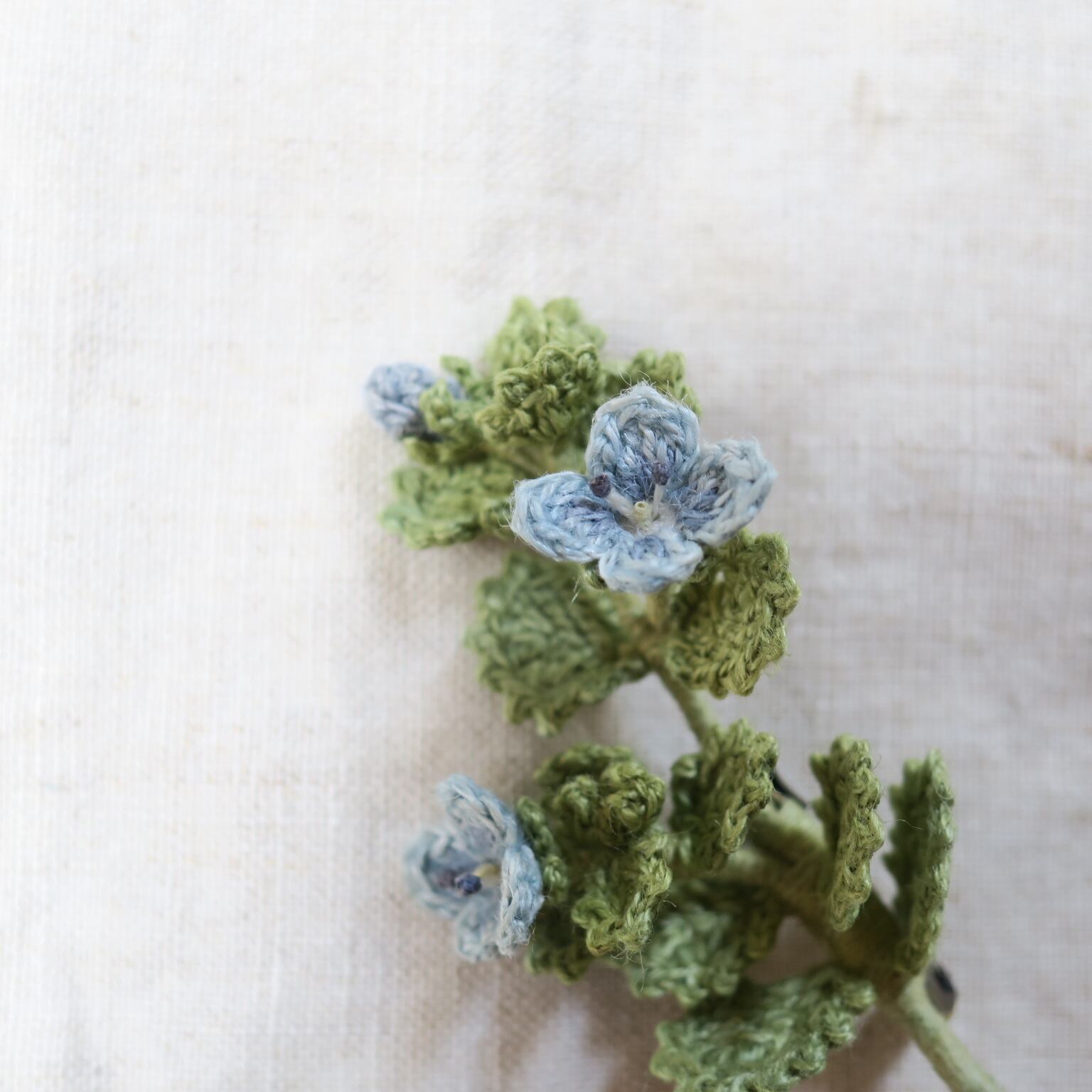 ■草木染めで染めた糸を、細いレース針でていねいに編んで作った、おおいぬのふぐりのコサージュです。
