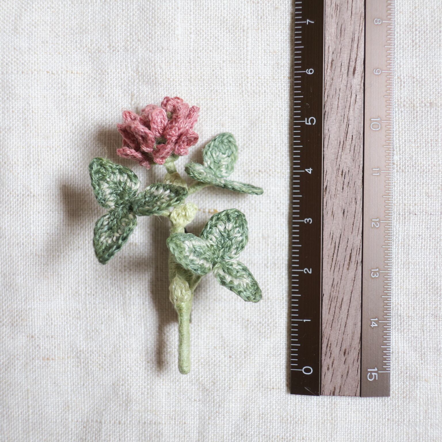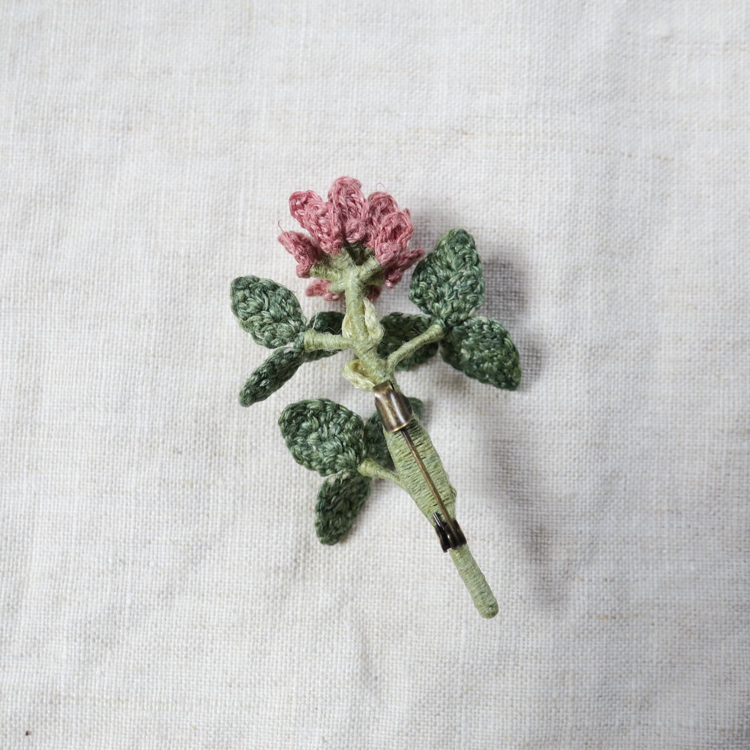 ■草木染めで染めた糸を、細いレース針でていねいに編んで作った、あかつめくさのコサージュです。