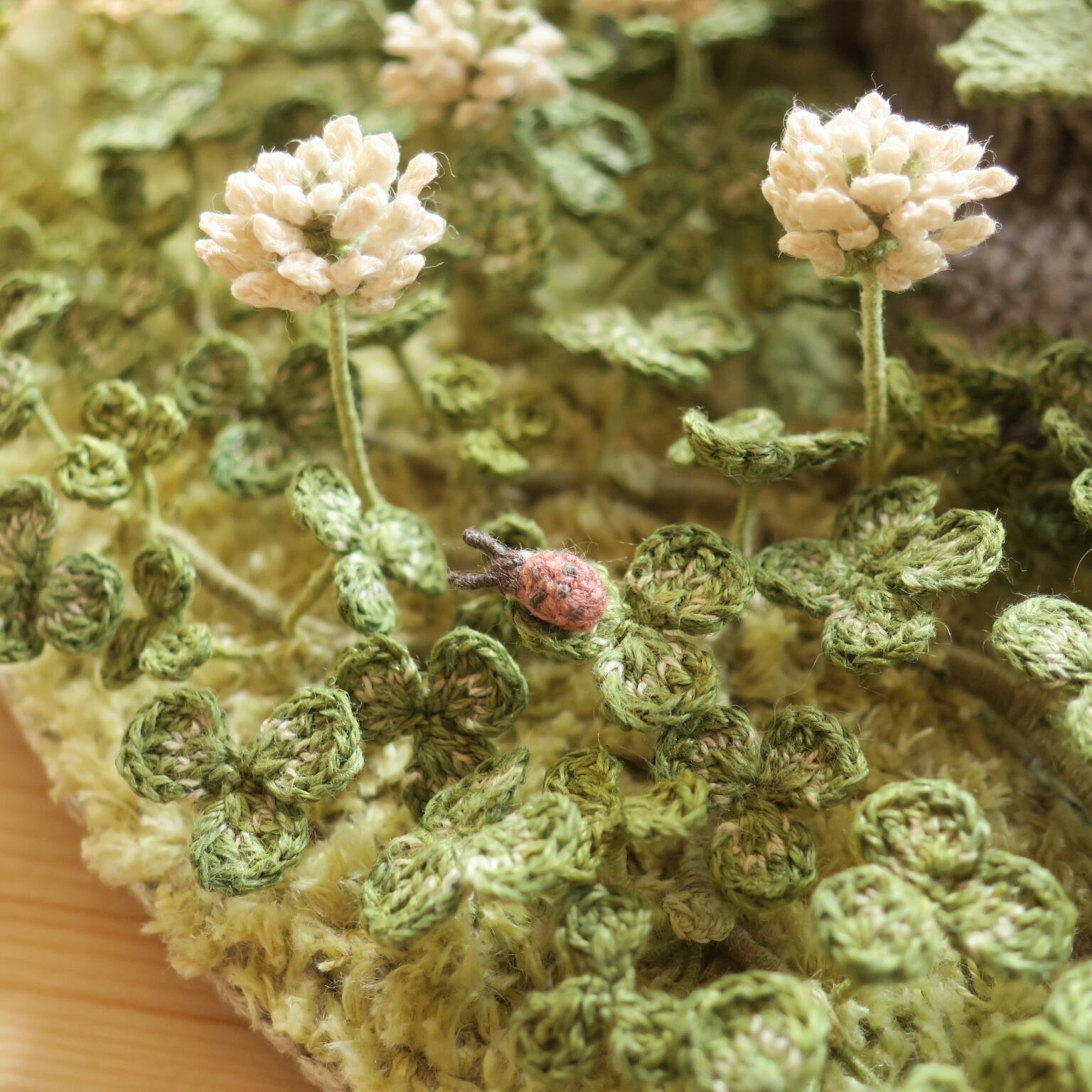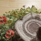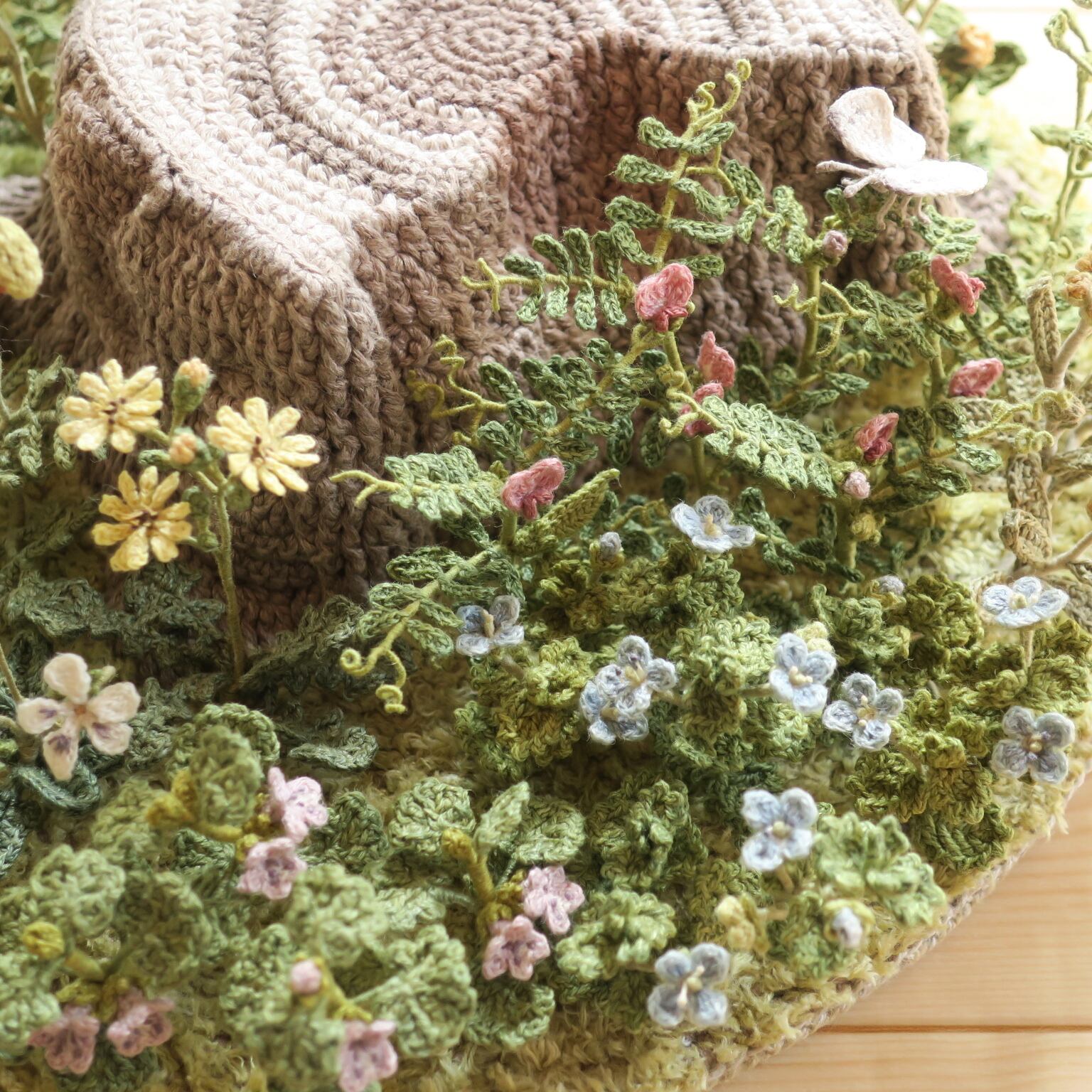 花や葉っぱを細いレース針でかぎ針編みし、ワイヤーに巻き付けて形づくり、1本1本土台に植えて作りました。